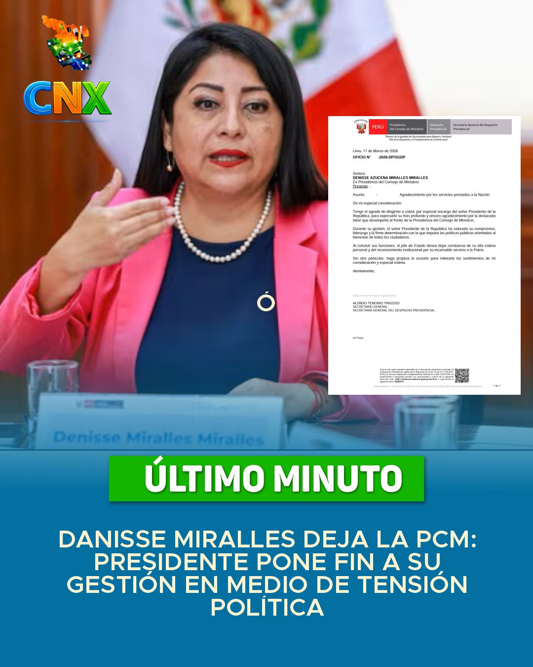 Lima, 17 de marzo de 2026. El Despacho Presidencial emitió un oficio oficial dirigido a Denisse Azucena Miralles Miralles, ex presidenta del Consejo de Ministros, en el que se expresa un reconocimiento y agradecimiento por su labor al frente del gabinete ministerial durante su gestión.